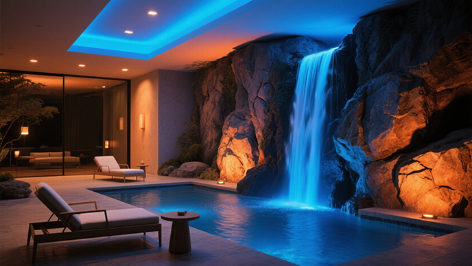 項目描述:塑石假山溫泉池以“天然洞穴巖洞秘境”為核心理念,通過水泥成型技術來模擬巖石的紋理,再結合藍色泳池和照明設計,營造出一個兼具功能性、視覺沖擊力和沉浸式體驗的特空間。