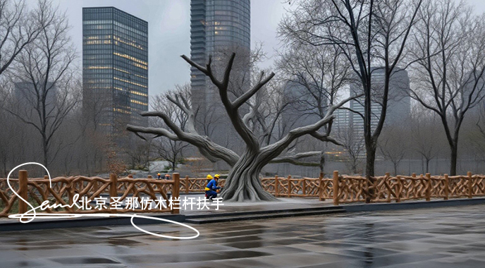 項目描述:北京廠家把兩個立柱間有兩根橫梁一根豎梁形狀的仿木圍欄叫兩段一豎仿木圍欄或兩橫一豎仿木圍欄。
